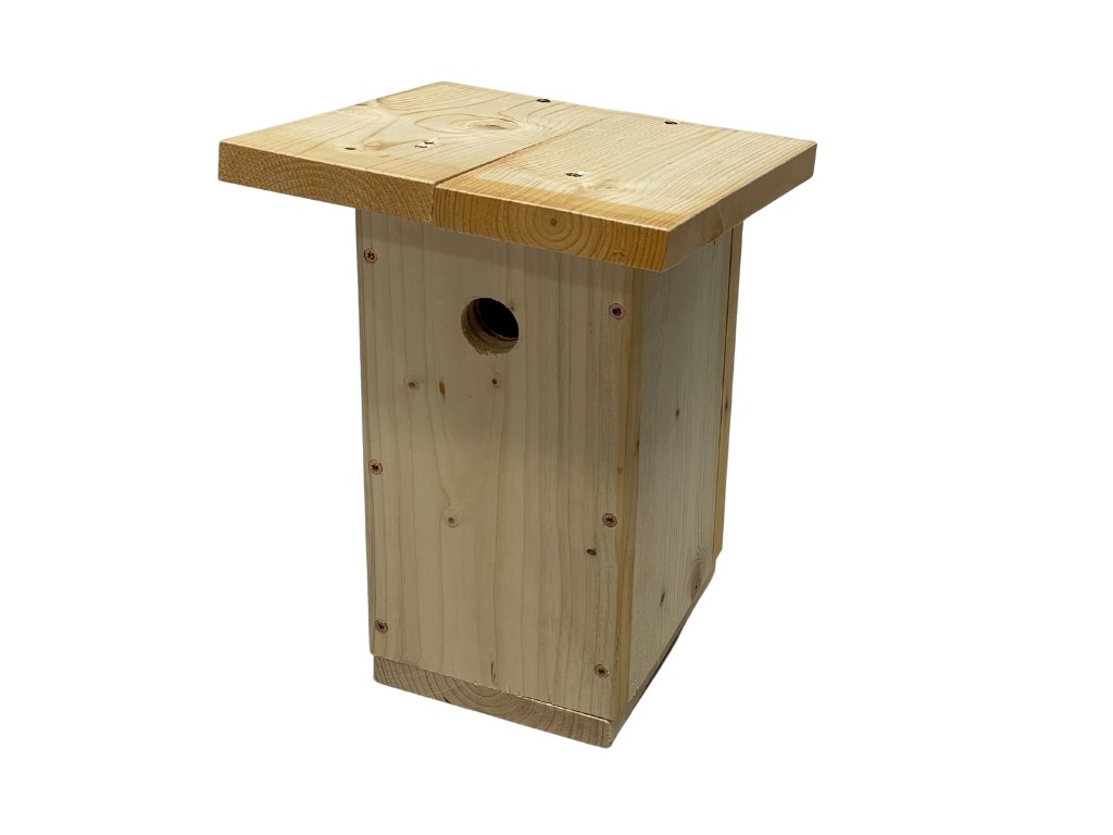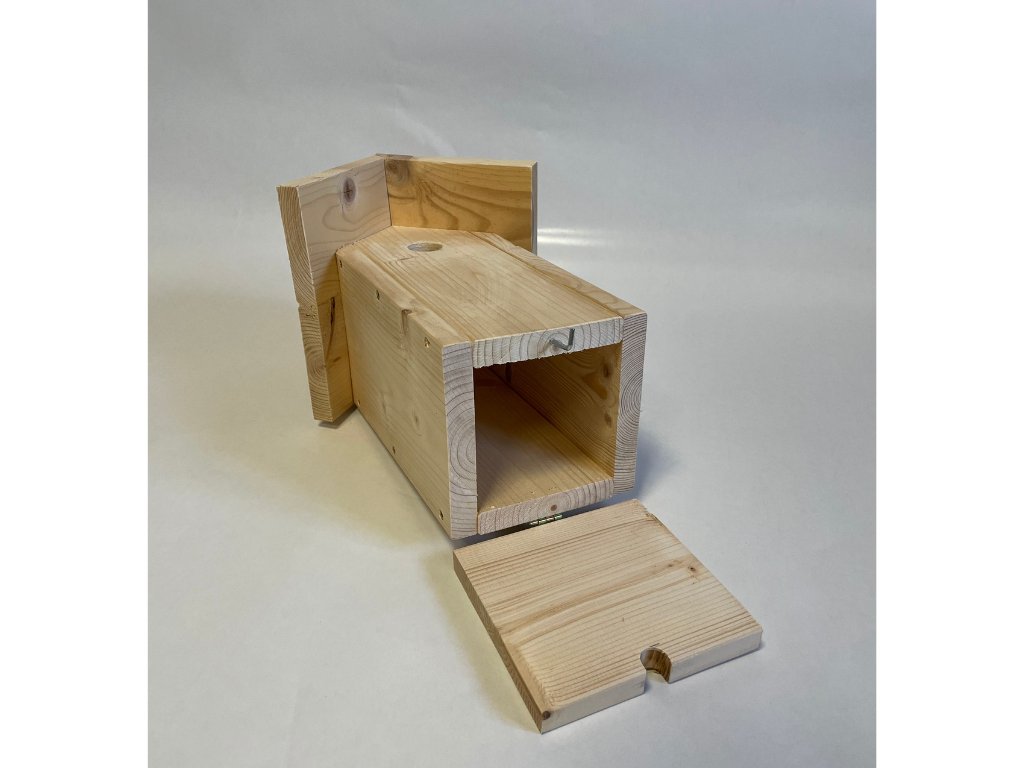 Budka je vyrobena z masivního dřeva o tloušťce 2–3 cm, což zajišťuje dlouhou životnost a odolnost proti dešti i mrazu. Díky rozměrům cca 33 × 29 × 18 cm poskytuje dostatek prostoru pro hnízdění a hluboká dutina chrání mláďata před predátory.