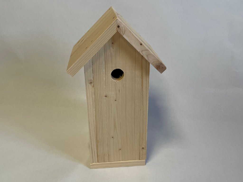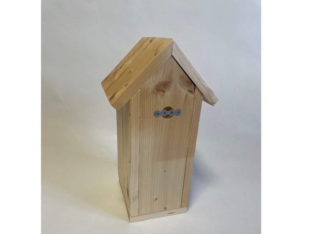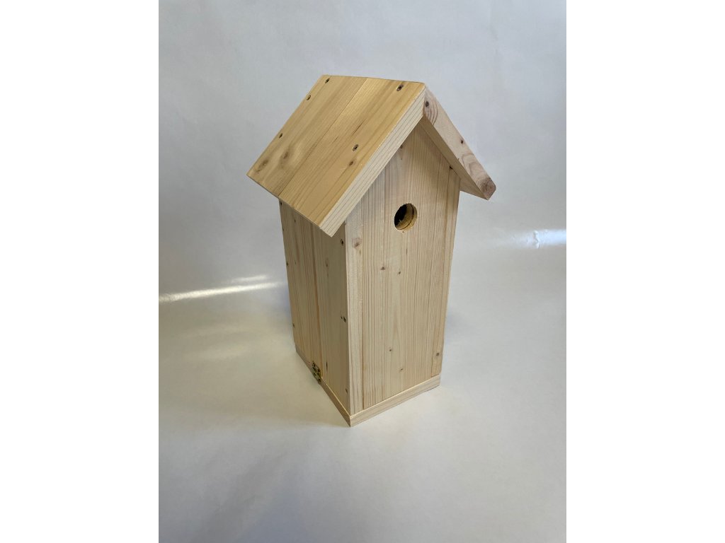 Dřevěná ptačí budka pro sýkorky a další drobné ptactvo. Odolná budka na zahradu s otevíracím spodkem pro snadné čištění. Rozměry: cca 33 × 29 × 18 cm.